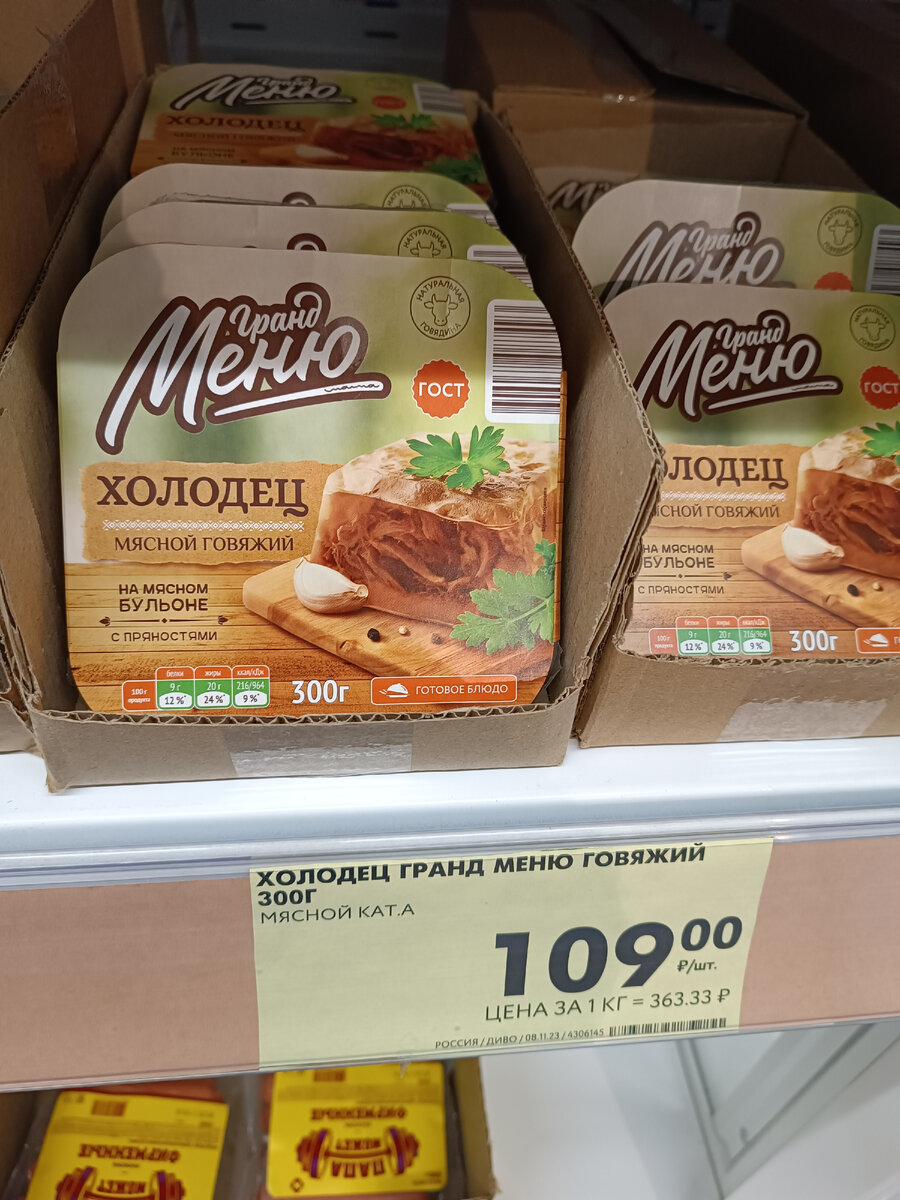 Приветствую, уважаемые! Я сегодня не только покажу все новое из магазина Чижика, но и купила на пробу из продуктов вот этот холодец! Сначала покажу упаковку с описанием 300 гр, изготовлен по ГОСТ, так написано на этикетке. Состав нормальный, показываю, можете кликнуть и увеличить, чтоб прочитать: Дальше уже из дома фотки тут вставлю. Жира немного сверху. Выглядит и ощущается на запах нормально. Если внимательно посмотреть, то и мяса там видно хорошо, волокнистая часть, прожилки были, когда ела, но их совсем мало. Мы с мужем поели по половинке, мне и ему по одному кусочку прожилков попались, которые не рзажевывались. А так вкусный. В морозилке еще увидела в коробках плов с мясом цыпленка замороженный. Блюдо готовое, нужно только разогреть, предварительно разморозив. Я хотела попробовать, но у меня нет микроволновки, поэтому размораживать мне сложно. Не с тала покупать. а состав показываю с коробки: В чем преимущество этого плова от тех, что продаются из холодильников в Магниха, Пяте