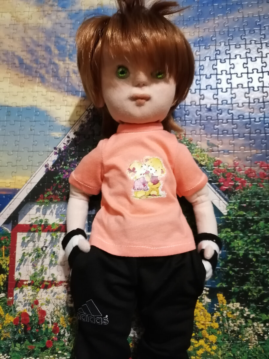 Здравствуйте! Отправила вчера своего мальчика к новой хозяйке. У паренька есть сменная одежда и игрушка - маленькая машинка. Мальчик тканевый, шарнирный. Поехал в замечательном трикотажном костюме, выполненным из футера. На ручках у него специальные перчаточки. Вся одежда снимается. На спортивных брючках есть карманчики. Обувка - тканевые кеды. Конечно, я люблю своего мальчика, шалунишку! В добрый путь! Надеюсь, он будет радовать свою хозяйку! Вчера не успела забежать в гости ко всем друзьям по д з е н у, сегодня исправлюсь, всех навещу! Совершенно не хватает времени!