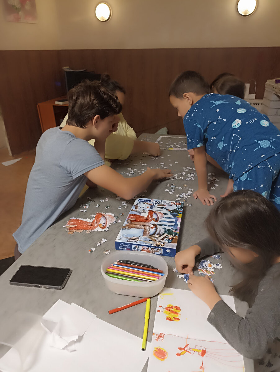 Доброе утро всем, кто уже выспался🙂. Сегодня суббота, время 8:40, а в доме тишина. Все спят🙂. Катюшка легла вчера в пол десятого. И, это при том, что днем не спала. Если шуметь никто не будет, то спокойно проспит до 10 утра. Она вообще последнее время стала редко спать днём. Если встанет в 8 утром, то спит. А если в 10, то спокойно до вечера играет без капризов. А мы вчера до полночи пазл собирали😄. Задание у нас такое было в календаре - собрать новогодний пазл. Заказала на ВБ. Хорошо, что на 500 штук, а не на 1000😂. Правда, не все собирали. Варя ушла спать, у неё учеба сегодня. Яна в принципе так долго сидеть не может. А вот Егор с Юлей спать не собирались. Занимались творчеством. Кто-то приходил из детей, кто-то уходил. Но, мы с Сашей, Дуней и Савой одолели эту картинку. Надо, наверное на каникулы ещё какой-нибудь купить. Перед сном Юля украсила свою комнату при помощи клея карандаша и своих рисунков 🤦♀️. Я уже увидела, как она последний вешала. Сегодня мальчики дома