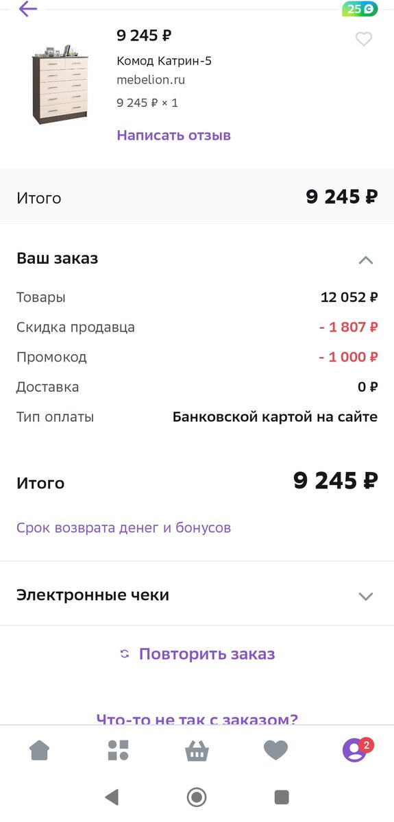 Ох, надеюсь мою статью не сочтут рекламой 😅 Но поделиться хочется, вдруг кто не знает. Я и сама не знала и не интересовалась, пока случайно у одного блоггера в коментах эту информацию не увидела. Так вот. В мегамаркете за покупки возвращаются бонусы спасибо. Да не просто возвращаются, а даже приличной суммой. Не всегда, но я в такую акцию щедрости попала. Как раз повезло и я нашла там именно тот комод, который хотела. И кешбек обещали солидный. Применила промик на первый заказ, скинули 1000. Оплатила 9245 и села ждать заказ. Долго ждать. Буквально в ждуна превратилась. Очень уж мне комод хотелось. Доставить его должны были в ТЦ неподалёку от моей работы. Думала муж после работы заедет, заберёт. В назначенный день я от телефона не отлипала, ждала оповещения о доставке. Но, дождалась звонка с неприятной новостью о том, что товар крупногабаритный и доставить его могут только в одно место в городе, в центре. Точнее, уже доставили туда. Доставку заказать уже нельзя, езжайте, забирай