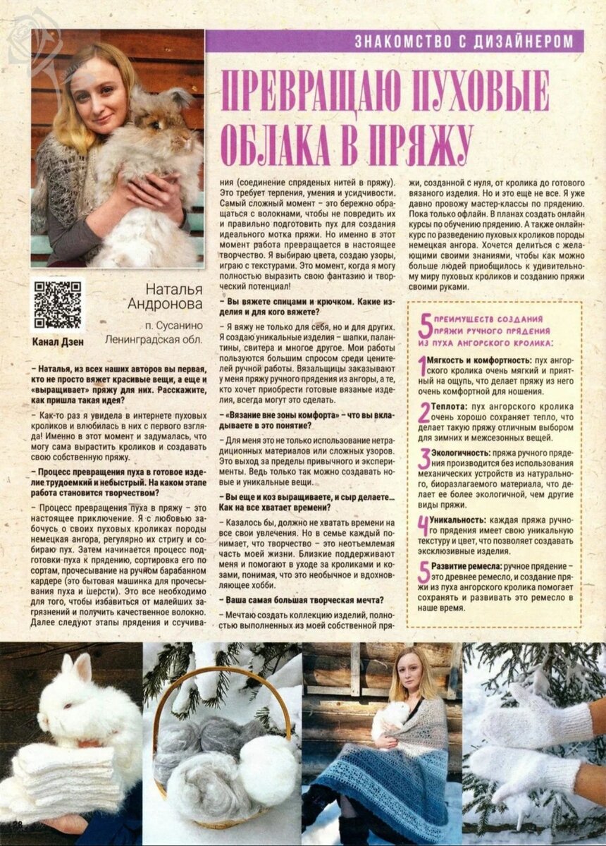 Ещё в начале этого года у меня брали интервью для журнала "Вяжем крючком". Сегодня поделюсь с вами материалами из него. Любовь с первого взгляда Как-то раз я увидела в интернете пуховых кроликов и влюбилась в них с первого взгляда! Именно в этот момент я задумалась, что могу сама вырастить кроликов и создавать свою собственную пряжу. Увлекательный процесс Процесс превращения пуха в пряжу - это настоящее приключение. Я с любовью забочусь о своих пуховых кроликах породы немецкая ангора, регулярно их стригу и собираю пух. Затем начинается процесс подготовки пуха к прядению, сортировка пуха по сортам. Прочесывание на ручном барабанном кардере(это бытовая машинка для прочесывания пуха и шерсти). Это всё необходимо для того, чтобы избавиться от малейших загрязнений и получить качественное волокно. Далее следуют этапы прядения и ссучивания(соединение спряденых нитей в пряжу). Это требует терпения, умения и усидчивости. Самый сложный момент - это бережно обращаться с волокнами, чтобы н