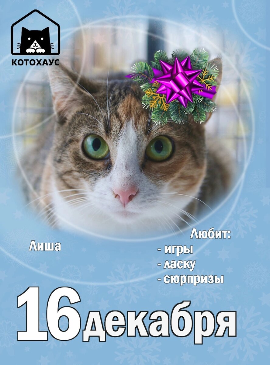1⃣6⃣ декабря. Новый день в календаре, кто же принял эстафету #Новогоднее_Чудо_сКХ в этот раз...☃❄🎅 Не откажется от внимания и возможности показать себя наша Лиша😊 Ласковая кошка-очаровашка, с гипнотическим взглядом! С Лишей будет каждый день, как праздник! Пёстрая шубка, весёлый нрав и желание быть рядом с человеком... А вы уже загипнотизированны Лишей?🤭 Приходите за ней скорее! Дедушка Мороз и Снегурочка, если вы не можете взять к себе Лишу, пожалуйста, помогите найти ей семью или подарите ей подарочки под елку (если что мы вам не подсказывали!🤫🤭): ❄ Пакетик вкусного корма на новогодний стол. 🥫🍽 ❄Игрушку под елку, чтобы не скучать 🪁 ❄Лекарства, чтобы не болеть в новом году ❄Средство для уборки, чтобы встретить Новый Год в чистоте 🧼🧽 ❄Самый главный подарок, который ждут все каждый день - обрести свою семью...👨👩👧🐈 Пишите в комментариях или в сообщения сообщества, что вы готовы подарить Лише и ее друзьям! Вы можете привезти подарки лично и побывать в гостях