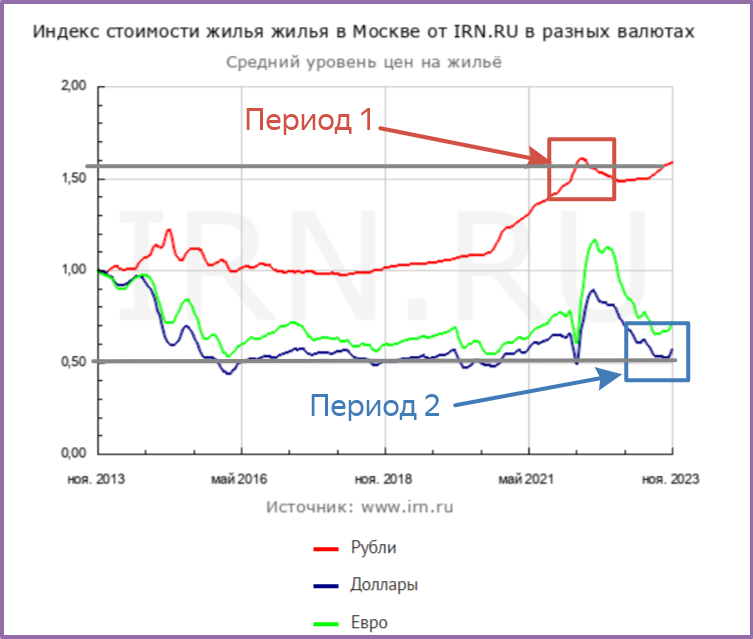 "Невыгодно" было купить квартиру за рубли в 2018 году и продать в районе близости к пику рублёвых цен в 2022 году (когда ВЗ был по 70+ в рублях, это Период 1). И, например, имея доллары, купить квартиру сейчас, когда доллар как минимум по 90+ - по ценам мая 2016 года (Период 2)?