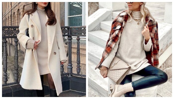 Благородный и дорогой аутфит у дам зрелого возраста получится благодаря трикотажному мини платью, однотонному пальто легкого оверсайз размера и высоким сапогам на грубой подошве.