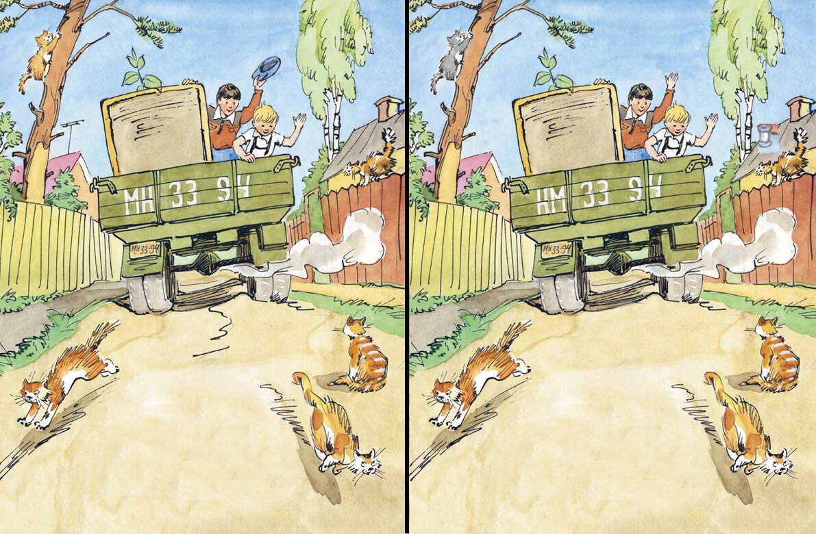 А вот и новый выпуск полюбившейся вам рубрики "Найди 5 отличий". Сегодня будем рассматривать иллюстрацию Юрия Узбякова к веселым стихам Самуила Маршака "Приключение в дороге". Это история про кота, который сбежал от своих хозяев во время поездки на дачу, и, конечно, вся семья вместе с шофером отправилась на поиски. Каждый нашел кота, по размерам и окраске похожего на беглеца. Когда вся компания с котами на руках возвратилась к грузовику, оказалось, что виновник суматохи давно вернулся и крепко спит в своей корзинке. Помните такие стихи? Иллюстрации к ним нарисовал известный карикатурист и автор журнала "Веселые картинки", который смог передать весь комизм ситуации в ярких, динамичных иллюстрациях.