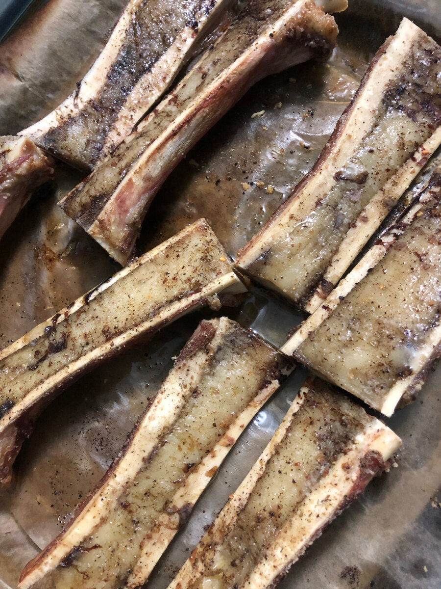 Мозговые кости в ресторане больше заказывать не буду, т.к. готовить их просто и подкорректировала некоторые моменты, которые не нравились при подаче в заведениях. Берём деньги, идем в магазин и покупаем мозговые косточки, цена - 1000 тенге/кг. Я купила 8 штук, вышло 2,7 кг., получается, что одна кость примерно 300-400 гр. Косточки нужно разморозить и зачистить от сухожилий, если они имеются на костях, но я не стала зачищать, т.к. у меня песель и ему будет интереснее их обгрызать Человек может съесть 1,5-2 косточки, из этого и расчитывайте сколько вам необходимо штук. Переходим к приготовлению: Разогреваем духовку до 180-200 градусов Выкладываем кости на противень, смазываем их оливковым маслом, солим, перчим. Спросите зачем жир мазать маслом, все просто, чтобы специи прилипли. Встречаются рецепты, где солят и перчат уже после того, как достали из печи, но мне нравится, когда соль распределяется по продукту, а не скрепит на зубах во время употребления. Отправляем противень с костями с