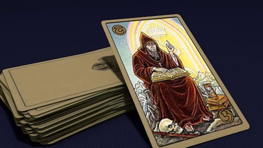 Высоко в горах сидит одинокий старец в монашеской одежде. На его коленях раскрыта книга судеб. Он постиг сакральные знания и укалывает нам на страницу. где записана и наша судьба. Возле ног его с одной стороны лежит человеческий череп (символ бренности жизни). с другой - стоят песочные часы, показывающие, что от момента рождения включаются отмеренные человеку судьбой годы, часы н минуты. Песок из верхней чаши практически вытек - время того, кто изображен на карте, заканчивается.