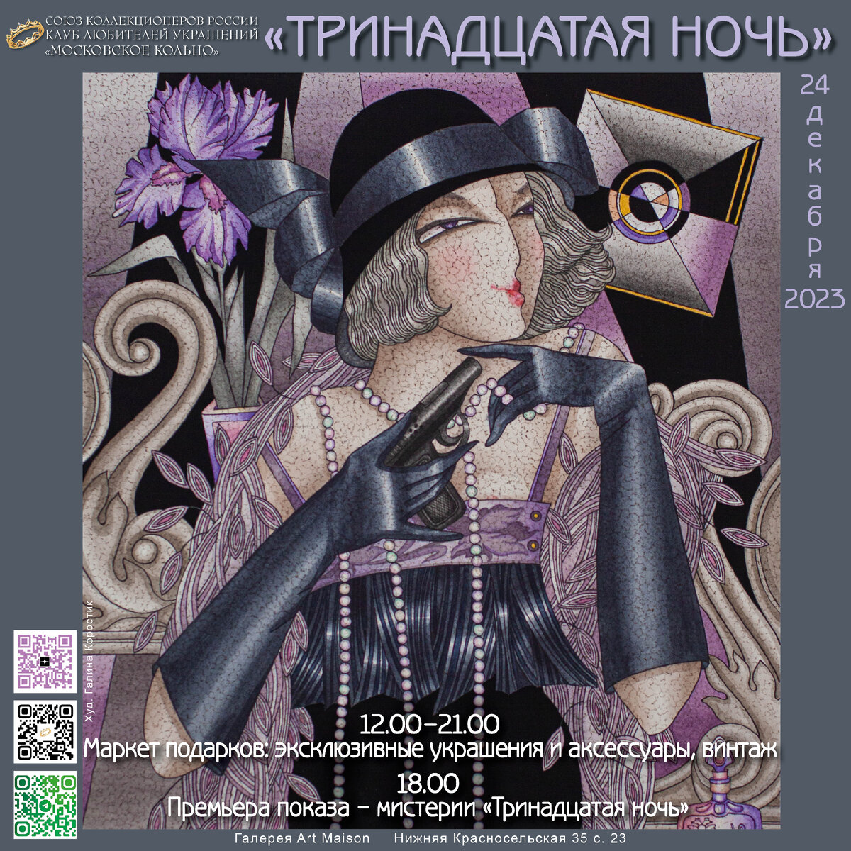 Начиная с ночи солнцестояния, самой длинной и самой темной,наступают Тринадцать волшебных ночей…. Что происходит в природе? Что говорят традиции? Об этом вы узнайте на театрализованном показе «Клуба любителей украшений «Московское кольцо» Союза Коллекционеров России. Круговорот года завершается, все четыре времени года прошли полный цикл.Четыре Стихии Земля, Воздух, Вода, Огонь, основы всего сущего засыпают. Тринадцать волшебных ночей - пограничное время открывающихся дверей между мирами, время остановки, когда прошлое закончилось, а будущее вот-вот должно родиться. Это самое благоприятное время, чтобы изменить свое состояние и задать вектор новой счастливой жизни на целый год. Сакральные дни, в которые судьба спускается землю. Когда Солнце доходит до самой нижней точки обитатели миров встречаются, и все соединяются в обмене дарами! В это время очень важно иметь неиссякаемый источник подарков, чтобы никто не остался обделённым! Именно поэтому весь день с 12.00 до 21.00 будет работать