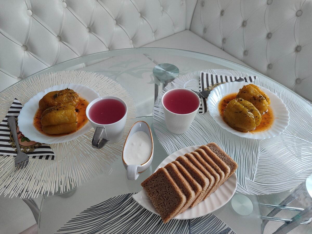 На обед я нафаршировала перчиков и ели мы их с чесночной сметаной и хлебом. Запивали киселём. Было очень вкусно, мама аж урчала от удовольствия) А мне прямо бальзам по сердцу, когда ей вкусно)