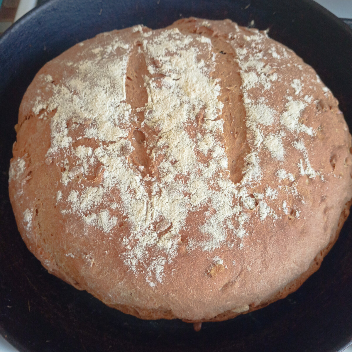 Сразу скажу для тех, кто ждёт от этого хлеба необыкновенного вкуса. Это обыкновенный домашний хлеб. Но он хорош тем, что тут практически нет дрожжей, нет сахара и мука цельнозерновая! Его однозначно оценят те, кто следит за здоровьем. В нём ничего химического. Надеюсь в муку ничего лишнего производитель не кладёт. Хотя сейчас не найти муку со сроком годности 6 месяцев. Всё по 12 месяцев. А это означает, что в неё добавили что-то для продления срока годности.