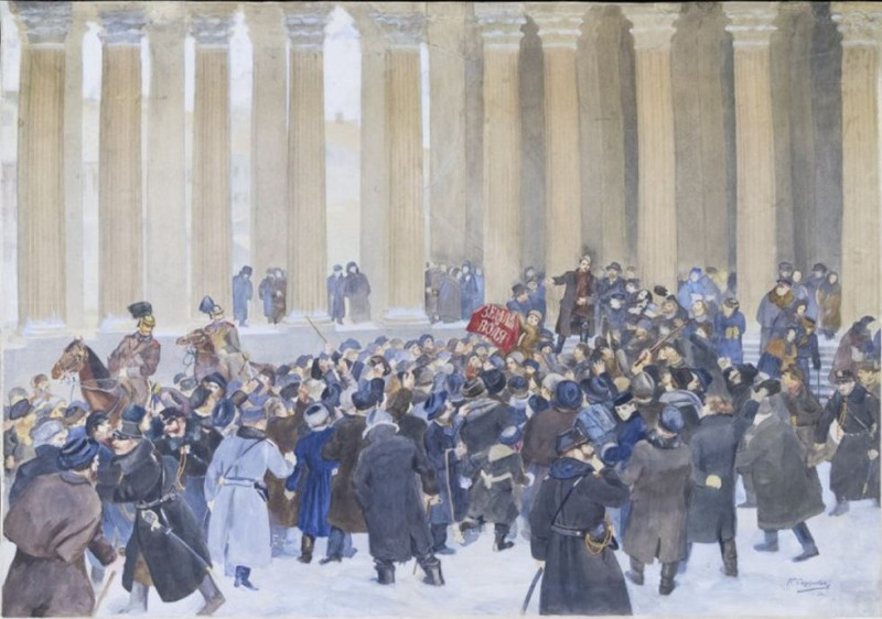 А это тоже Казанский собор, июль 1917 года. И снова красные знамёна, только разгоняют демонстрантов не царские городовые, их больше нет, а казаки либерального и даже отчасти «социалистического» Временного правительства. Георгий Плеханов его поддерживал. Павел Соколов-Скаля (1899—1961). Июльская демонстрация в Петрограде в 1917 году. 1939