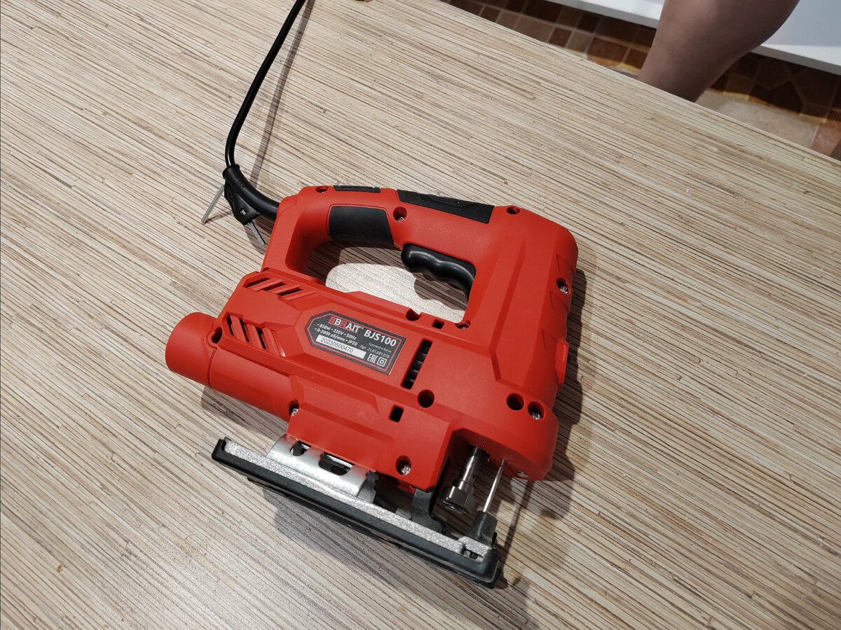 Намечался ремонт кухни и сборка нового кухонного гарнитура. А без электролобзика в этом случае, конечно же, не обойтись. Одно дело вот такой мощный станок распиловки в строительном магазине, где мы покупали стеновую панель или "фартук" для кухни... Но нам конечно такой не потянуть.) Решили посмотреть подобие) на любимом Озоне. Из широкого ассортимента, представленного там, наш выбор пал на лобзик бренда BRAIT. Мощность этого лобзика 850 Вт, чего вполне достаточно для бытовых работ по дому. Визуально также выглядел симпатично. Это лобзик оснащён лазерной направляющей и подстветкой. Лазером пока не пользовался, а вот подсветка отлично помогала в работе. Мне было удобно разглядеть разметку на столешнице. Имеется регулятор скорости и несколько режимов маятникового хода. С маятниковым ходом можно пилить быстрее, но частота реза уменьшится. При распиле старого ящика из-под мойки, частота не требовалась, а с маятниковым ходом можно это сделать быстрее. Раз, раз и готово! Отверстие под
