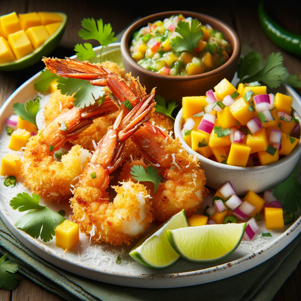 Сегодня мы приготовим Креветки в кокосовой панировке с манго-сальсой. Ингредиенты: Манго-сальса: Приготовление: Креветки в кокосовой панировке с манго-сальсой - это современное фьюжн-блюдо, сочетающее в себе вкусы тропических стран и традиционной американской кухни. Это блюдо отражает многообразие американской кулинарии.