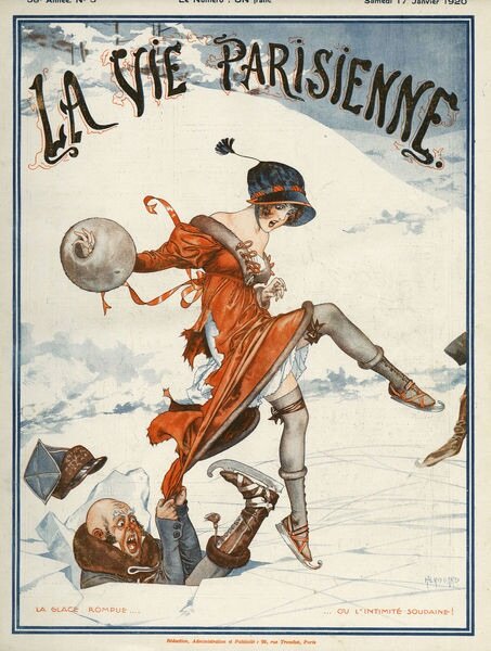 Журнал La Vie Parisienne был основан в Париже (кто бы не догадался) в 1863 году. И стал очень популярен в первые двадцать лет ХХ века. В те далекие времена даже нынешний мастодонт женского мирка Vogue желал быть похожим La Vie Parisienne. Этот журнал заправлял женскими судьбами не только парижанок, но и американок, англичанок, и теми, кто хотел быть на волне событий. Сегодня бы это был интеллектуальный вариант какого-нибудь Космополитана. Интеллектуальный потому, что фотографии заменяли шикарнейшие иллюстрации, над которыми трудились лучшие иллюстраторы и художники Парижа эпохи модерна. Сплетни, литературные опусы, модные тенденции - все это привычно и за давностью лет уже не так интересно, ибо часто бывало написано на злобу дня. Но иллюстрации сделали La Vie Parisienne культовым. С 1905 года журнал последовательно освещал тенденции в так называемом "новом искусстве" - это тоже ар нуво. И этим La Vie Parisienne бесценен для истории - с него начались эксплуатации женской сексуальности,