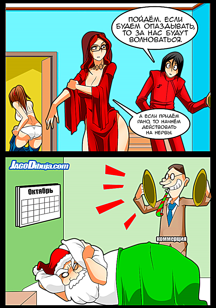 Это героини известных комиксов карикатуриста Джона Александра Герра Диас (более известен любителям его творчества как JAGODIBUJA). Надо сказать, что в его зарисовках очень много фансервиса. Девушки героини щеголяют в откровенных нарядах, чем иногда смущают до жути своего соседа по дому, Артура (и раззадоривают зрителей). А ещё в этих комиксах много иронии, бывает чёрный юмор, бытовые темы. Рисовка в стиле японских мультиков - аниме, что позволяет качественно передать эмоции персонажей. Яркие краски, порой щекотливый, но понятный взрослый юмор. Неудивительно, что серия выходит уже больше 10-ти лет (с 2012 г.) В этот раз, в преддверии скорых зимних праздников отобрала для вас специальные рождественские выпуски. Красотки София - хипстерша и Эрика - геймерша, а также их друг Артур уже ждут своих зрителей. Не стоит воспринимать эти шутки про рождественского волшебника остро, ведь это авторское видение. В принципе, у нас же тоже рассказывают анекдоты про Деда Мороза. Вот и Санта Клаус в коми