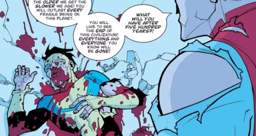1. Непобедимый против Омни-Мэна. В 12 выпуске Нолан рассказывает Марку истинную причину, почему он прибыл на Землю. Нолан говорит сыну, что всегда считал людей за муравьёв, а все его близкие все равно погибнут. Марк злится из-за этого и нападает на отца.