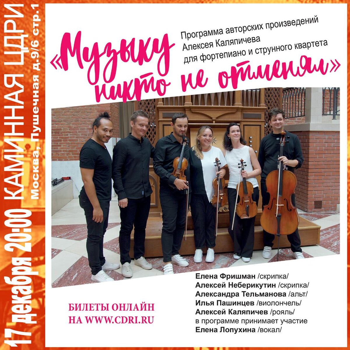 Программа авторских произведений Алексея Каляпичева для фортепиано и струнного квартета Для композитора и лидера коллектива важны художественность и содержательность пьес, которые должны дарить конкретные эмоции и оставлять яркие впечатления, и обязательно исполнение на эталонном уровне — что и обеспечивают собранные в состав прекрасные музыканты, лауреаты международных конкурсов: Елена ФРИШМАН (скрипка)