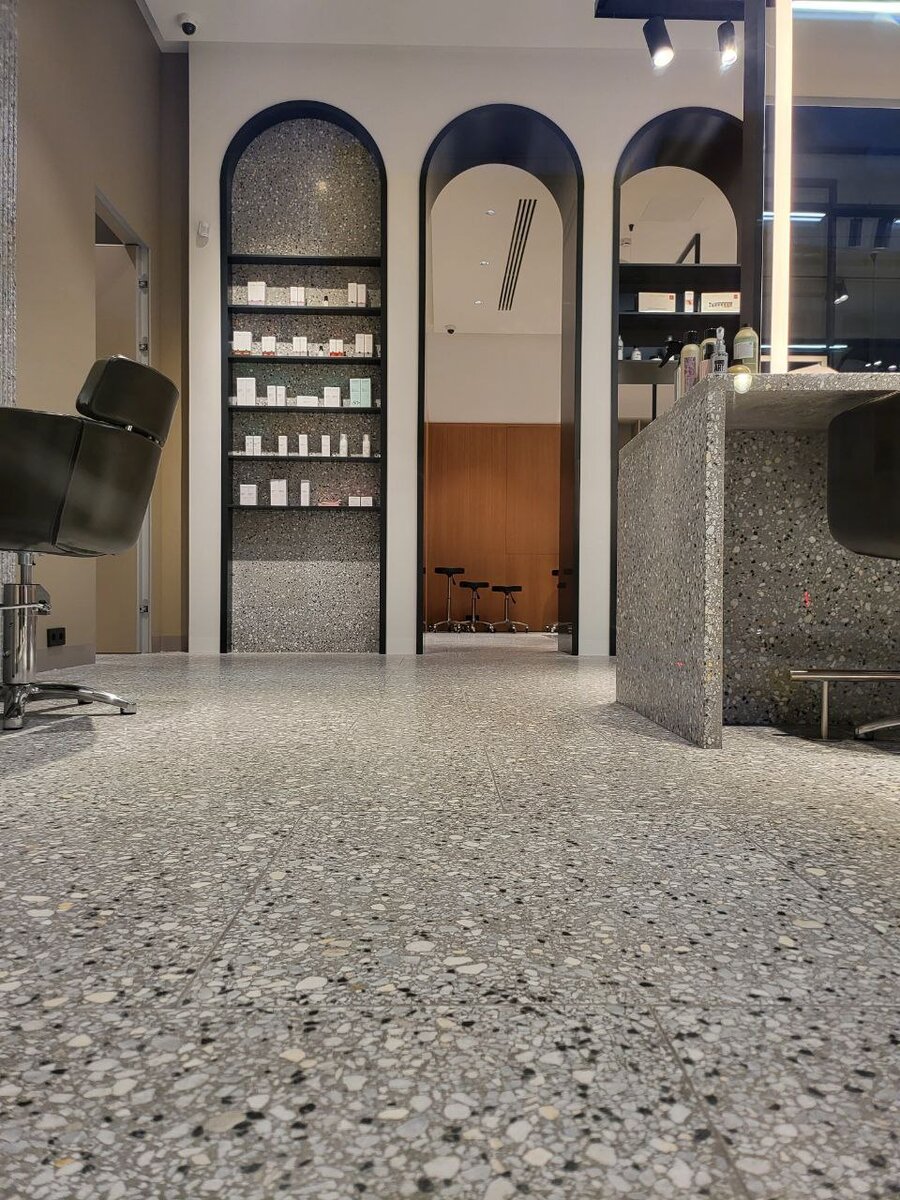 Безопасность, эстетика и функциональность в одном: разбираем, почему терраццо — это идеальный выбор для мокрых зон. Исследование каменных покрытий показало, что мрамор и некоторые другие виды камней не выдерживают воздействие хлорки, что делает их непригодными для использования в бассейнах и смежных пространствах. Но что насчет терраццо? Как правило, терраццо, содержащий вкрапления мрамора, также не является оптимальным выбором в этом случае. Однако благодаря нашим технологическим разработкам, у нас есть специальные составы терраццо, которые обладают уникальной устойчивостью к агрессивному воздействию хлора. Теперь это покрытие не только безопасно, но и великолепно вписывается в дизайн бассейнов, бань, спа и других мокрых зон. Антискользящие свойства терраццо Одним из дополнительных преимуществ терраццо в мокрых зонах является его естественная шероховатость. Эта особенность не только придает материалу эстетическую привлекательность, но и делает его нескользким. Таким образом, в
