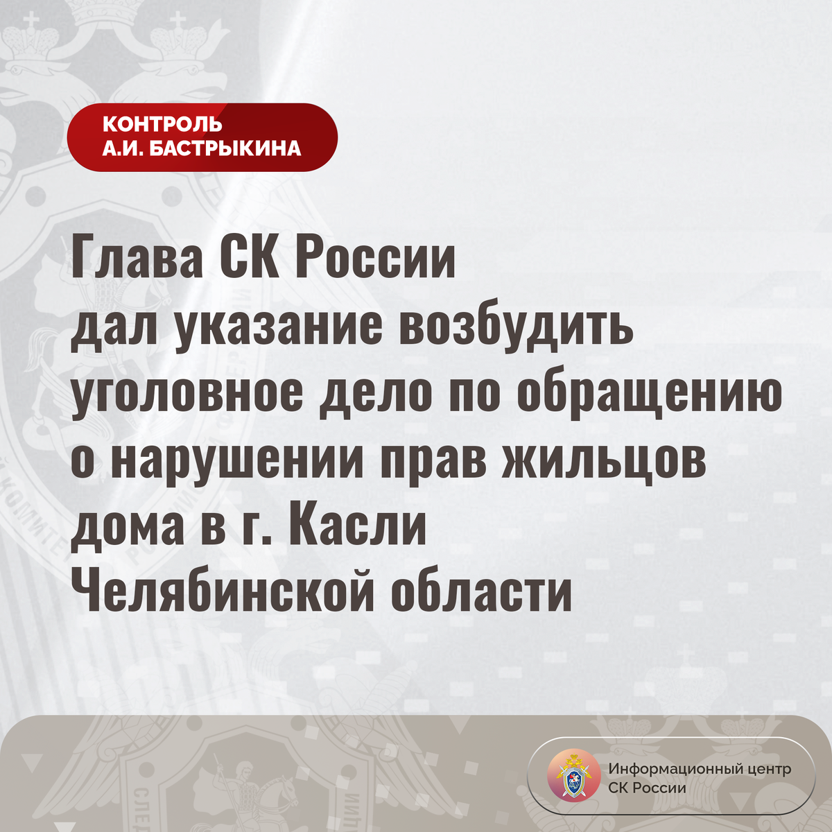 Председатель Следственного комитета Российской Федерации Александр Иванович Бастрыкин дал указание руководителю СУ СК России по Челябинской области Петру Геннадьевичу Решетникову возбудить уголовное дело и представить доклад о ходе и результатах его расследования.