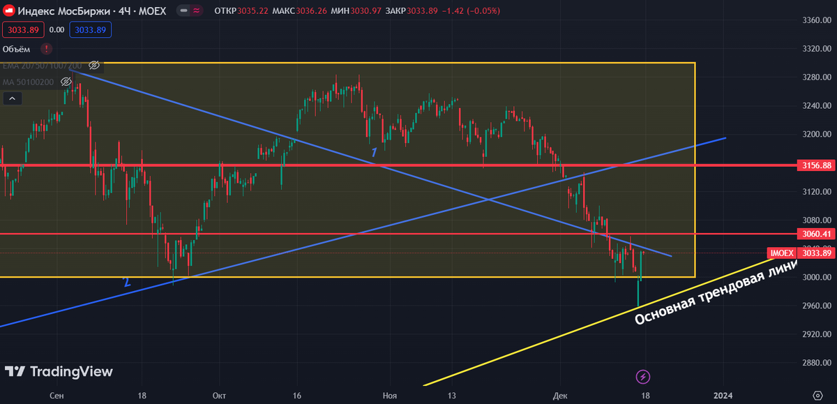 Здравствуйте! Очередной недельный разбор (18-22 декабря). Показываю свои цели по топ-10 акциям российского рынка Индекс МосБиржи На прошлой неделе пробили нижнюю грань боковика, коснулись 2960 пунктов и отскочили обратно в зону боковика (в пятницу рынок откупили на 2,5% – такой сильный рост связан с массовым закрытием шортов). Торгуемся пока в рамках нисходящего тренда. На данный момент нет каких-то признаков сильного снижения рынка РФ – все это чушь. На следующей неделе ожидаю рост индекса к уровню 3060 пунктов. Только сначала вероятно снижение до 3000 пунктов, а оттуда уже будем отскакивать и пробивать уровень 3060 пунктов. В ближайшее время достижение 3300 пунктов (верхней грани боковика) невозможно при такой высокой ключевой ставки (ставка ЦБ РФ – 16%, а средняя див. доходность по рынку – 12%). 📌Сбер В пятницу Сбер вырос на целых 4,5%. Краткосрочно цели выше – 270 руб. Ну и 280 не за горами. 📌Газпром Бумага идет на уровень EMA200 – 170 руб. Здесь планирую слить некоторую часть с