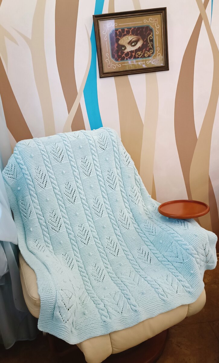 Пряжа для пледа Alize Cotton Gold, цвет 522 Мята, состав 55 хлопок и 45 акрил, 330м в 100гр. Вязать в 2 нити. Для размера 150х110 см нужно 10 мотков. Спицы 3,5мм. Окантовка пледа Верх-низ пледа: Первые и последние 16 рядов вязать платочной вязкой, чтобы получилось 8 изнаночных дорожек. Стороны пледа справа и слева: В начале и в конце каждого ряда (лицевого и изнаночного) вязать 8 лицевых петель. !Важно: - Для красивого края справа и слева полотна пледа каждый ряд начинать и заканчивать, провязывая петлю лицевой и в лицевом, и в изнаночном рядах. Таким образом, получим узелковые крепкие края. - Вязать в шахматном порядке 2 основных узора с квадратом платочной вязки: 1) в начале пледа 2 дорожки узором1 по схеме 1, меняя его с квадратом платочной вязки; 2) в середине пледа узором2 по схеме 2, меняя его квадратом платочной вязки; 3) в конце пледа снова повторить 2 дорожки узором1 по схеме 1, меняя его квадратом платочной вязки. А также можно вязать и весь плед узором2 между окантовко