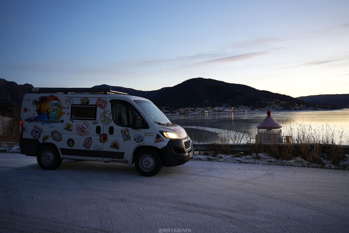 Помню свои попытки посмотреть зимнюю Норвегию в феврале и марте, когда вдоль дорог были такие сугробы, что тогда еще внедорожный микроавтобус был ниже, чем некоторые из них. Другое дело Норвегия в декабре... Расскажу немного впечатлений и особенностей путешествия по зимней Норвегии на самодельном кемпере Peugeot Boxer L1H1. Единственным существенным недостатком такого путешествия будет лишь короткий день. Температура воздуха около фьордов не опускается ниже 5 градусов ночью, но если уехать в глубь страны, то можно легко провалиться из +5 в -28. Мы такой перформанс испытали на себе. Но кемпер выдержал, водопровод не замерз, печка справилась, а значит все ОК. Из-за короткого дня все пейзажи вокруг словно в утренних сумерках, независимо от времени суток, не считая ночи. Сделать солнечные фото зеленеющих лугов точно не получится, но в этом есть свои прелести. Например, осенью и зимой в Норвегии очень мало туристов. Практически все парковки и места для стоянок пустуют. Не надо искать место