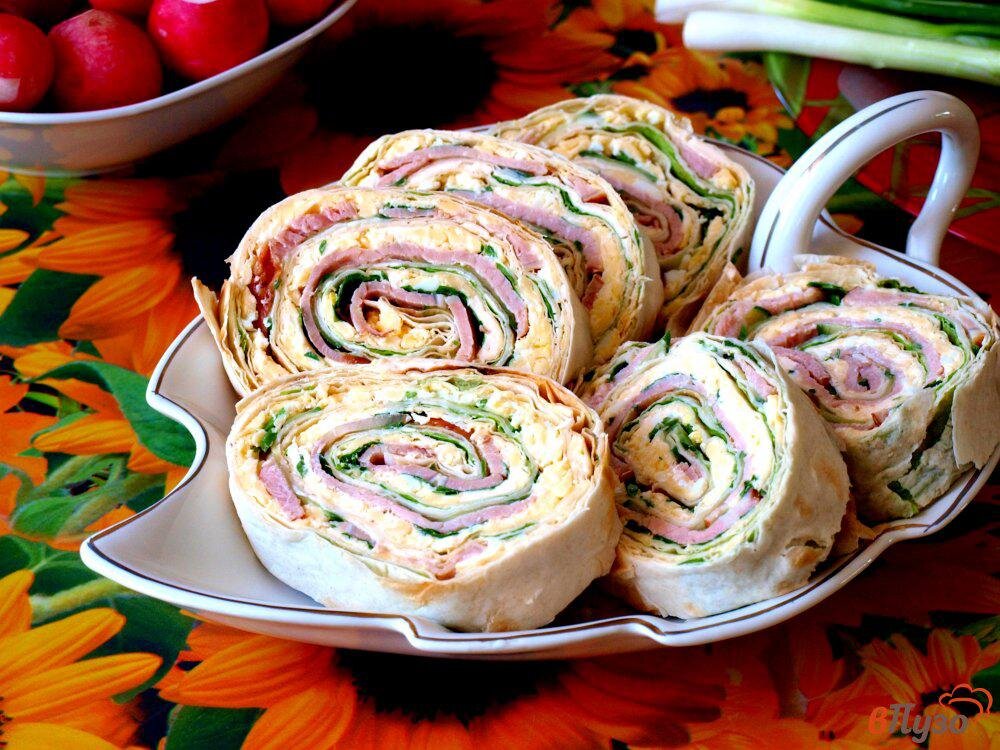 Вот простой рецепт новогодней закуски - рулетики из лаваша с ветчиной и сыром: