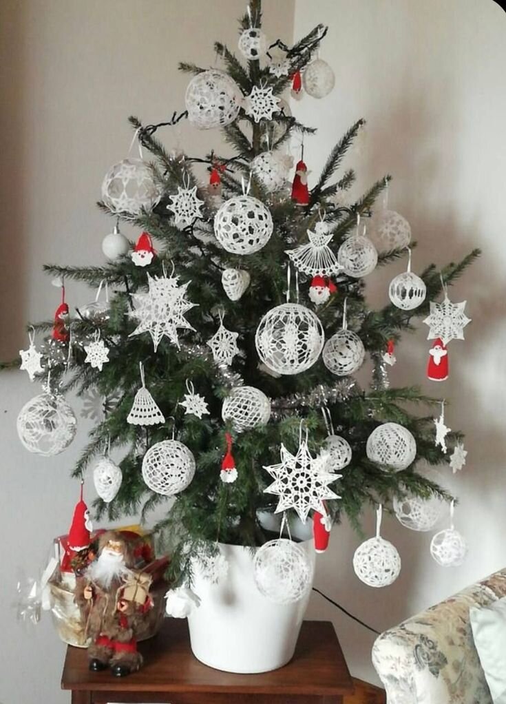 Я совсем недавно наткнулась в интернете на елочные игрушки, связанные крючком, они меня просто заворожили. Посмотрите на эту красоту. Конечно, мне захотелось попробовать и связать такие игрушки. В этой статье, я покажу, что у меня получилось. Свои игрушки я декорировала бантами. И так я показала Вам, что у меня получилось, а теперь подробнее остановлюсь на процессе. Вязать игрушки не сложно и достаточно быстро. До Нового Года еще есть время и вы сможете связать такие игрушки для вашей елочки или на подарок. За вечер можно связать несколько штук, потом только останется придать им форму и на утро игрушки готовы. Разнообразие игрушек просто поражает и включив фантазию, можно придумать, что-то эксклюзивное. И так, что нам нужно: 1. Найти схему. 2. Пряжа. 3. Крючок. 4. Формы. 5. Клей ПВА. Я использовала разную пряжу, фото прилагаю. Крючок для всех игрушек № 1, 25 На более тонкой пряже, игрушки получаются чуть меньше, но ненамного. Формы – это, пожалуй, самое сложное