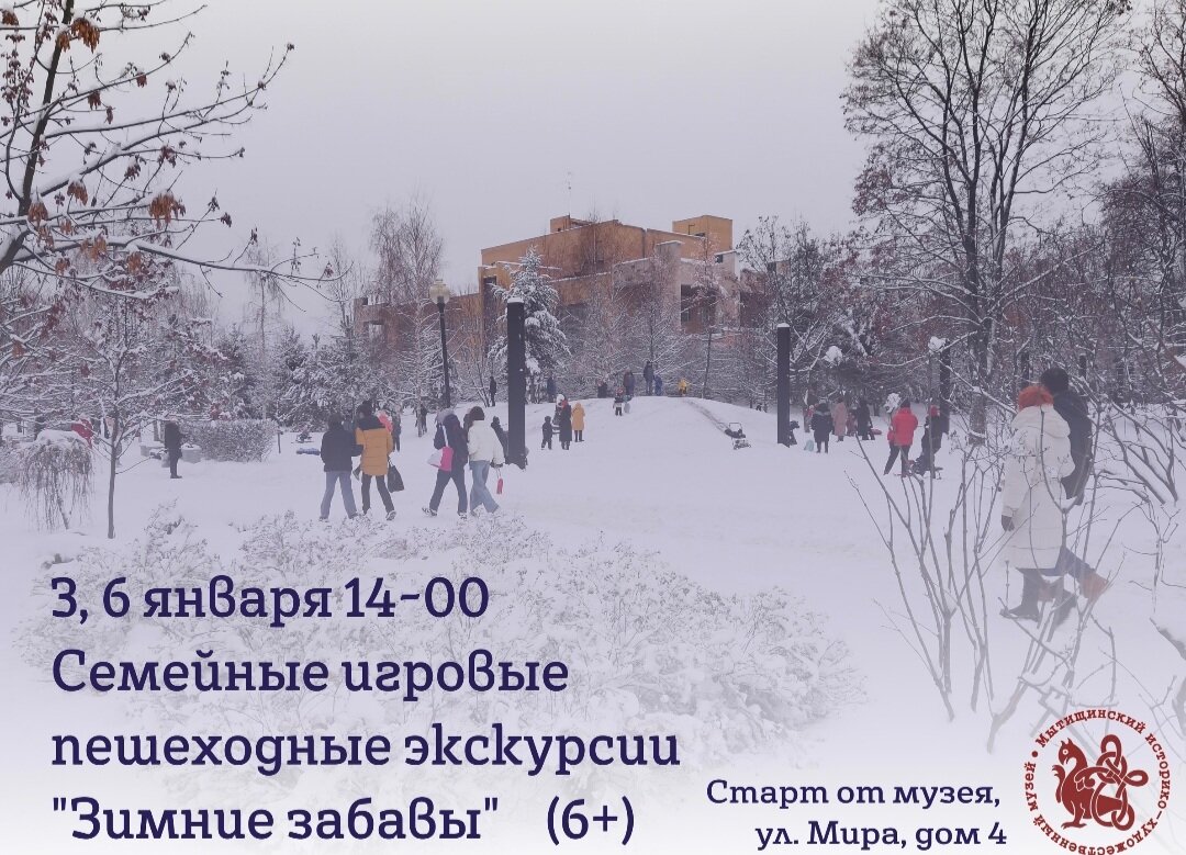 Мытищинский историко-художественный музей приглашает весело и познавательно провести новогодние выходные! 3 и 6 января в 14-00 пройдут семейные игровые пешеходные экскурсии «Зимние забавы». Старт каждой экскурсии от музея (ул. Мира, дом 4) финиш на площади перед ДК «Яуза». Во время экскурсии мы увидим самые красивые места центра Мытищ, прогуляемся по парку, увидим памятники, оценим малые архитектурные формы, новогоднее убранство городского округа, набережную реки Яузы. Продолжительность экскурсии 2 часа, все участники перед началом экскурсии получат ссылку на папку с историческими фотографиями города. Также доступна запись на другие экскурсионные программы в удобное для вас время. Записывайтесь, гуляйте по Мытищам вместе с нами и узнавайте интересные факты об истории родного городского округа! Записаться на экскурсии можно по ссылке на сайте музея: https://mytyshimuseum.ru/posetitelyam/zakaz-ekskursii-vne-muzeya/ #Мытищи #Мытищинскиймузей #мытищимузей