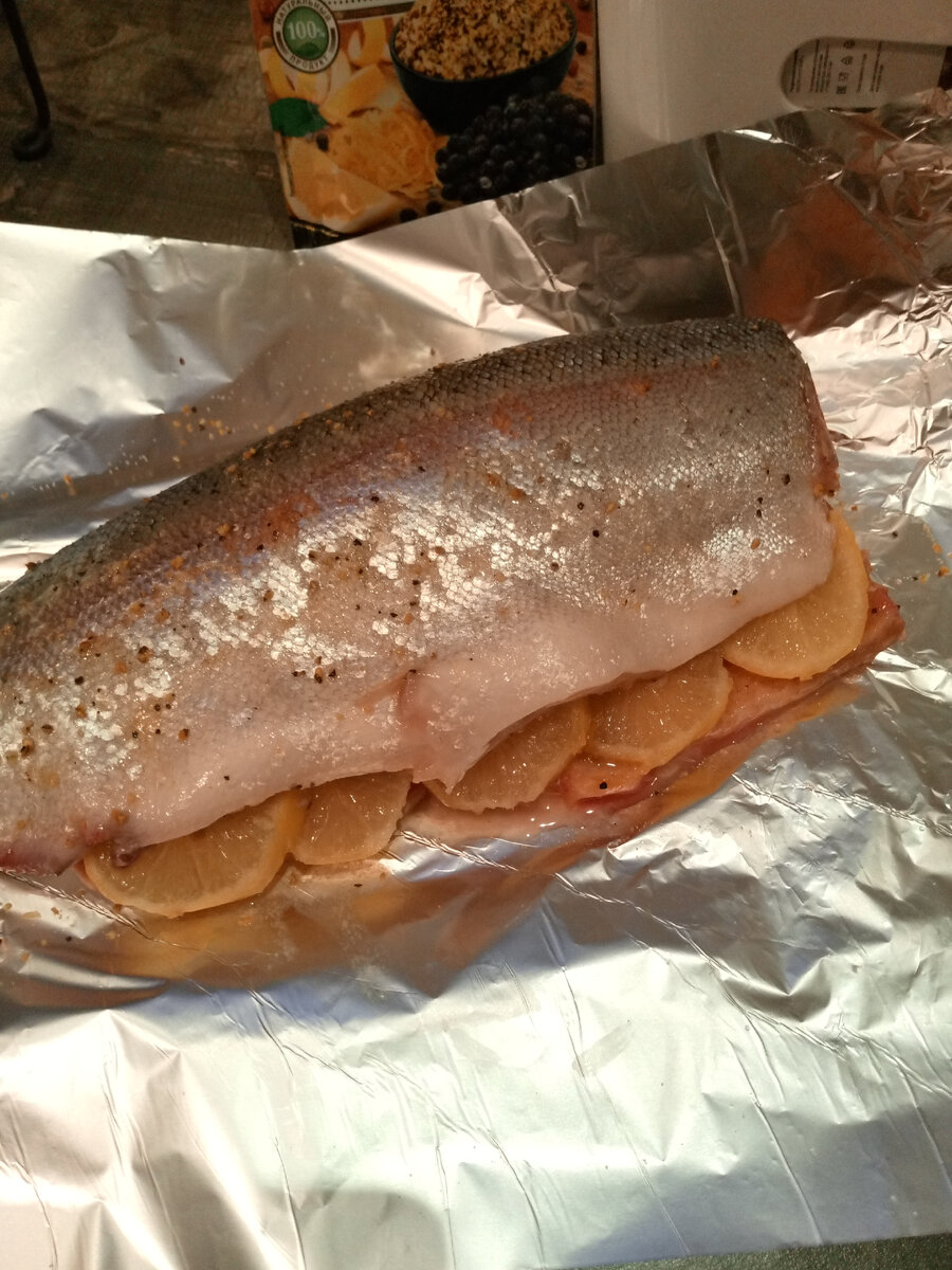 Рыбу мы едим нечасто. Я не люблю возиться с ее очисткой, да и, признаться честно, не совсем умею) Поэтому, когда уж очень хочется, беру обычно рыбу без чешуи. Купила свою любимую форель. Да, сейчас недешево это все, но поскольку едим рыбу редко - решили все-таки угоститься. Рыбка вытянула почти на 1 килограмм. Выпотрошила, отрезала плавники хорошо промыла. При приготовлении я использую лимонный перец и соль. Всю тушку натереть и снаружи и внутри, дать немного "отдохнуть и напитаться. В пузику закладываю нарезанный кружочками лимон. Красотка правда? Заворачиваем ее в шубу из фольги и запекает до готовности. Кто любит поджаренную шкурку - за 10 минут до готовности раскрыть фольгу - рыбка подрумянится. На гарнир салат из овощей - перчик, огурец, помидорка, кинза - люблю похрустеть! Немного сметаны и черного кунжута. Ммммммм!!! А еще в шкафу нашлась бутылка белого вина.. Раз такое дело, сказал муж, надо и брускетты наши любимые сделать с вялеными помидорами. Вот такой получился вкусный су