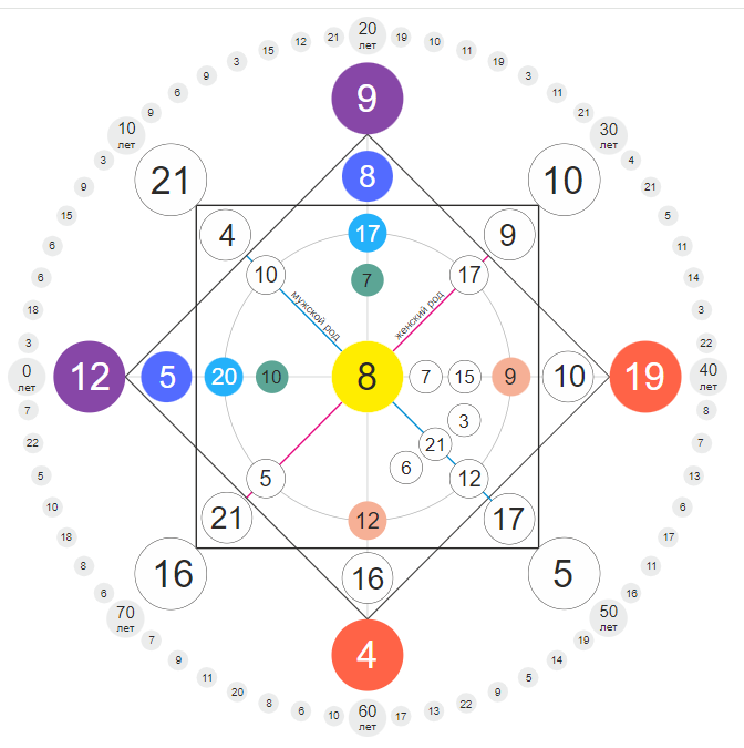 Для начала нам нужно понять, что за человек перед нами, кто это, из чего соткан, на какой волне он. И мы смотрим характер, центральную точку. Здесь 8 Аркан - перед нами честный, строгий, конкретный, правильный, уверенный в себе и в своей правде, ответственный, трудолюбивый, проницательный, здравый, гармоничный товарищ. У него есть свои правила, свой свод Законов, свои моральные и этические нормы, как кодекс чести. И это нечто непоколебимое, он абсолютно уверен в нем, следует ему, что, к сожалению, может делать его слепым, циничным, агрессивным и эгоистичным.