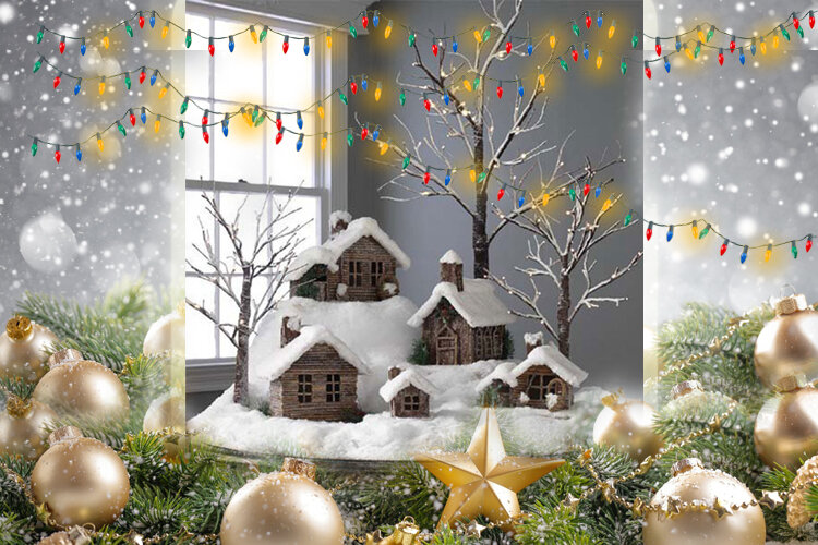 - новогодние композиции, которые могут быть составлены по-разному – еловые ветки, фонарики, свечи, фигурки птичек и оленей, бумажные/деревянные домики и другие элементы праздничного декора;