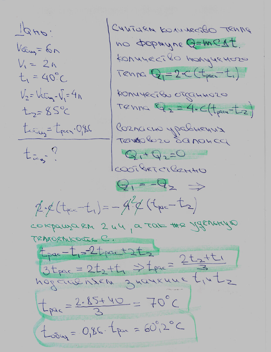 Задача: Вместимость системы охлаждения автомобиля 6 л. В радиатор влили 2 л тёплой воды при температуре 40С, а затем дополнили систему горячей водой при 85С.Определить реальную температуру смеси, учитывая, что она на 14% ниже расчётной. Решение: Вначале находим расчётную температуру. Для того что бы обе части воды привести к одинаковой температуре, более горячая часть должна отдать тепло более холодной. Считаем какое количество тепла должна получить более холодная и отдать более тёплая. Записываем решение. Я в дано записал объём в литрах, но поскольку один литр воды весит один килограмм, решение буду записывать сразу килограммах.