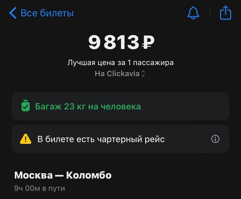 Просматривая регулярно сайты для покупки авиабилетов – я часто нахожусь в шоке от того, как цены рознятся от моего представления! Чаще я получаю приятные эмоции от просмотра. Для себя я выяснила – по миру может путешествовать каждый, главное подобрать правильную дату и рассмотреть много вариантов. Если поехать не в самый сезон, то можно урвать билеты дешевле даже 5 000р. Как мы все знаем, чем больше спрос на товар, тем дороже он становится. Некоторые места не пользуются спросом из-за того, что мы заранее думаем о невозможности финансово потянуть путешествие. Океан и экзотика кажется нам чем-то более дорогим, чем та же поездка в Турцию. Давайте взглянем на реальные цены билетов. В качестве популярных стран для поездок мы рассмотрим: Тайланд, Турцию, Черногорию и Кипр. На первой фотографии мы видим рейс на Шри-Ланку. Цена составляет всего 9 000 р. Никаких пересадок – рейс прямой. Далее показан рейс в Стамбул – столицу Турции, которая у многих возникает в голове при выборе места для отпу