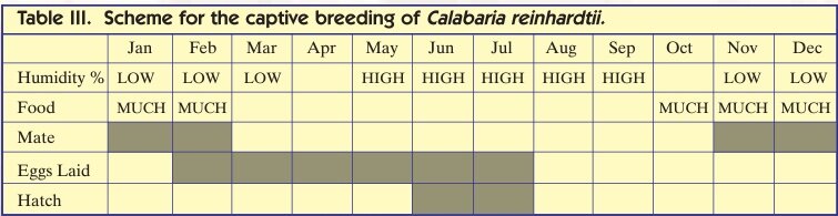 Статья является дополнением к уже написанному обзору по калабариям. Недавние данные показывают, что дикие калабарии обычно размножаются раз в два года, хотя есть сообщения, что в неволе могут и каждый год. Разводных калабарий днем с огнем не сыщешь. Молодняк, который иногда можно найти чаще всего получен от приехавших из природы беременных самок. Основными ограничивающими факторами размножения в неволе являются инкубация яиц и масса тела самок. Самкам, по-видимому, требуется более длительный период акклиматизации, чем самцам, вероятно, из-за больших затрат энергии, необходимых для производства яиц. Пол можно определить путем клоакального зондирования, хотя это не всегда просто. У самцов зонд уходит на глубину 10–11 подхвостовых чешуек, у самок около 3. Разведение, по-видимому, зависит от определенных факторов окружающей среды и питания. В неволе следует моделировать естественный сезонный цикл Западной Африки, чередуя влажные и засушливые периоды. В дикой природе калабарии спариваются в