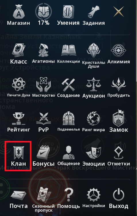 1. Сначала зайти в меню "Клан";