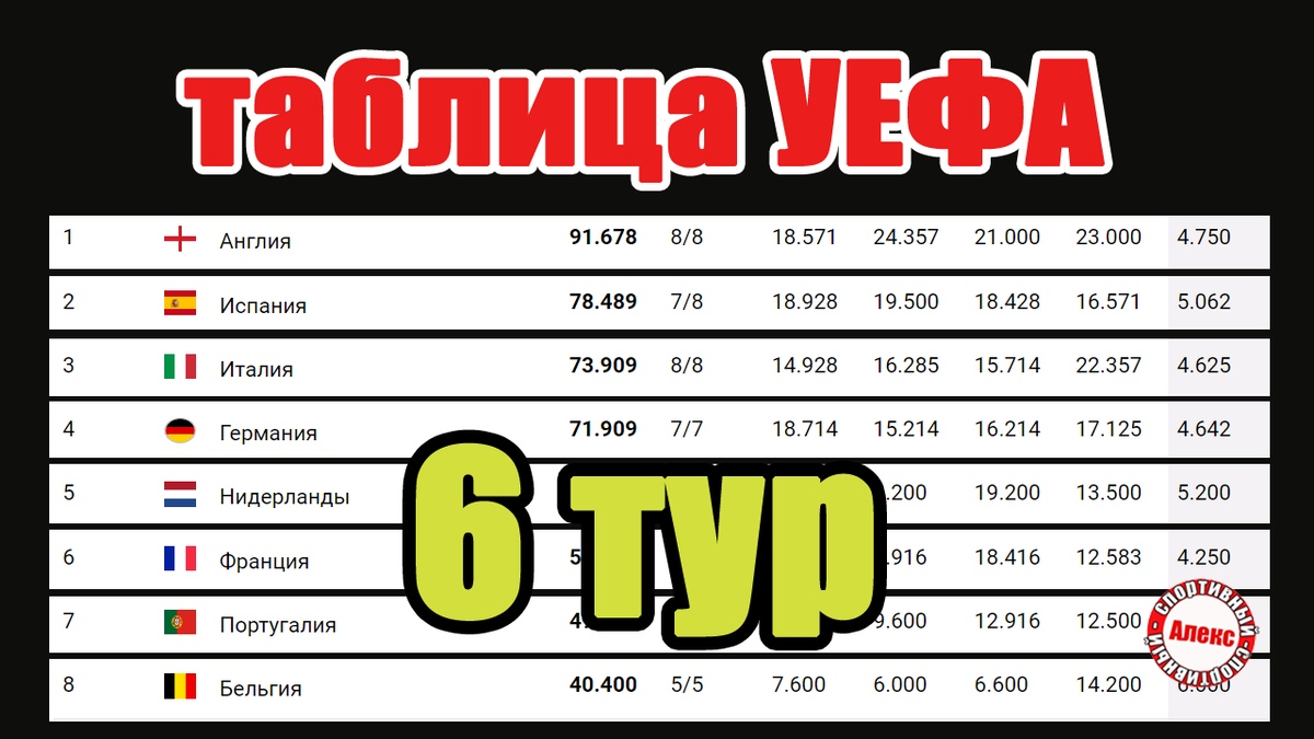 Привет, друзья. Вы на канале «Алекс Спортивный». Обновилась таблица УЕФА после завершения групповых этапов. Какая страна стала лидером недели, и кто остался без команд? Россия опустилась на 29-е место. Нидерланды занимают 6 место. На этой неделе копилку удалось пополнить на 0,6 очка. АЗ отсеялся. Аякс, ПСВ и Фейеноорд продолжают играть в различных турнирах. Франция на 5 месте и идёт без потерь. Все 6 команд выбились в плей-офф. Прирост недели 1,5 очка. Германия занимает 4 строчку. Многие команды заранее выходили в игры на вылет и получали соответствующий бонус, поэтому на этой неделе 1 балл. Унион попрощался с еврокубками. Италия сберегла все 7 заявленных команд. Никто не вылетел. После 6 тура стране начислили 2,286 очка вместе с бонусами за выход в плей-офф. Испания остаётся на втором месте, отставая от лидера на 14 очков. Всё идёт к тому, что испанцев скоро догонят итальянцы. Перенейцы потеряли в группе Севилью. Ранее в квалификации выбыла Отсасуна. Итого осталось 6 команд. + 1,3 оч