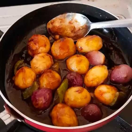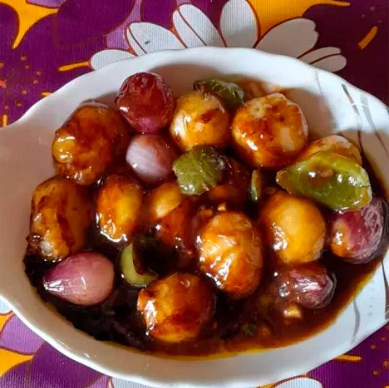 Ингредиенты: молодой картофель, репчатый лук, стручковый зеленый чили, растительное масло, соль, кукурузная мука, соевый соус, соус чили, томатный соус Рецепт: Baby Potato Manchurian Время приготовления: 15 мин.