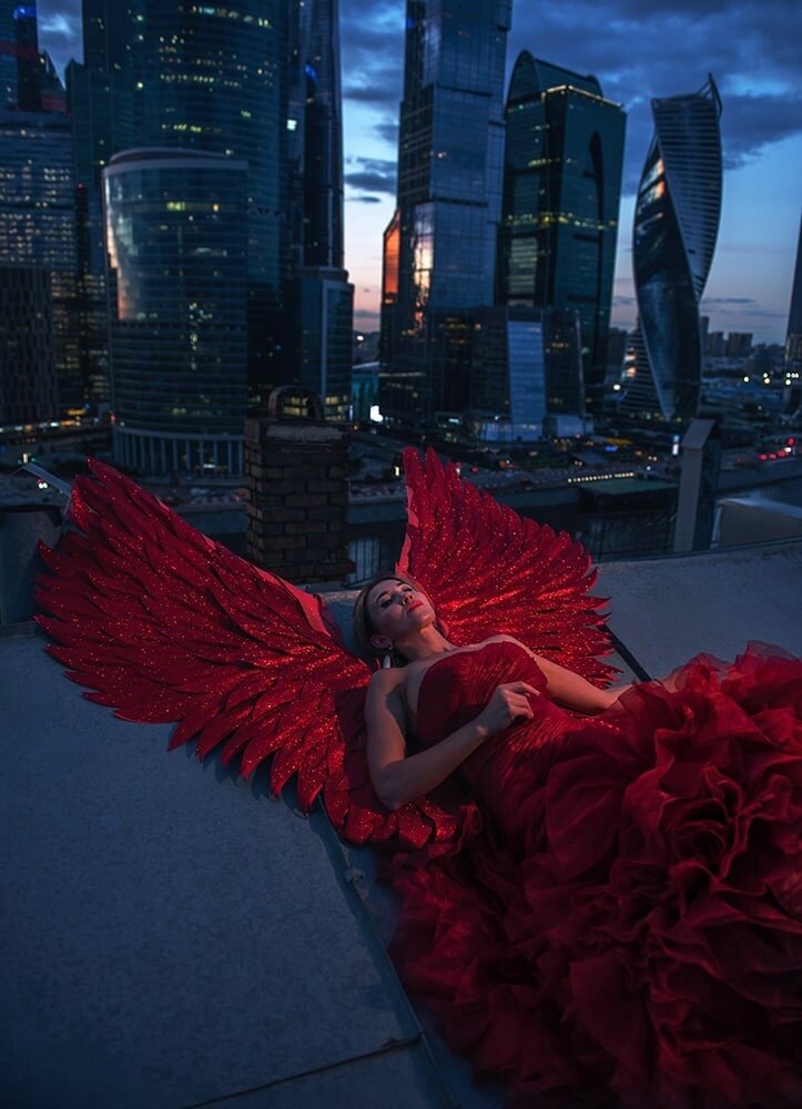 Образ девушки в красном костюме с крыльями