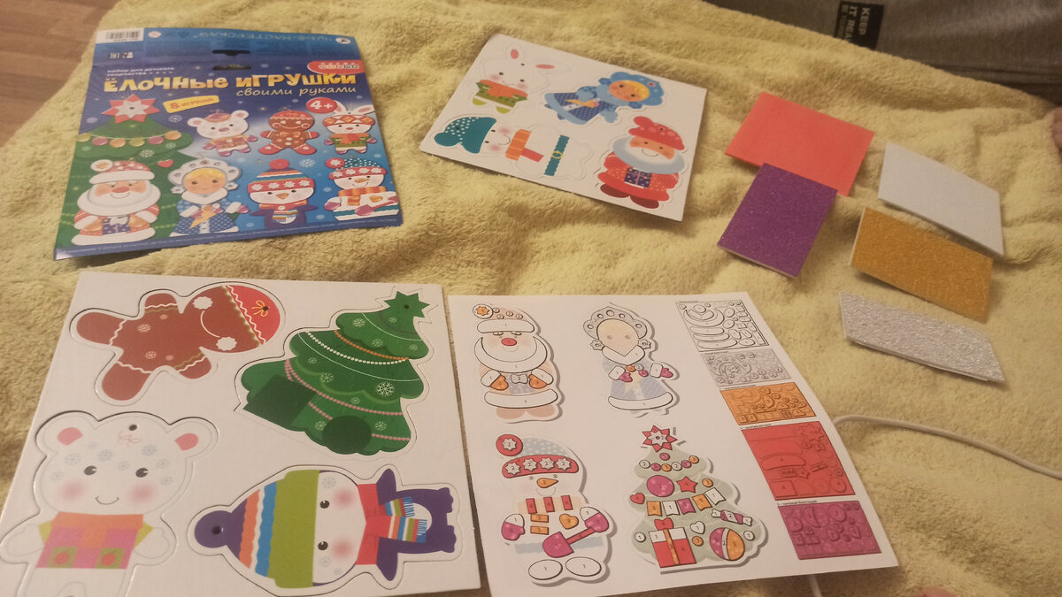 Всем привет. Не реклама, просто делюсь. Прекрасный вечер с детьми в поделке игрушки на елку. Купили такой набор 8 елочных игрушек из картона, 5 полотен с наклейками, которыми нужно украсить игрушки, веревочка ( ее надо разрезать) инструкция, что куда клеить. Очень интересно, делали с мужем и крестницей
