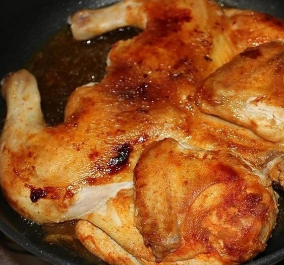 Для приготовления понадобится 1 цыплёнок весом около 1 кг, 4-5 зубчиков чеснока, соль, перец, 3-5 столовых ложек растительного масла, зелень. Цыплёнка разрезать по грудке и отбить с двух сторон, придав плоскую форму. Чеснок пропустить через пресс, добавить соль, перец. Хорошо перемешать. Натереть этой смесью цыплёнка. Положить под гнёт и оставить на 2-3 часа. Выложить цыплёнка на разогретую сковороду с маслом. Сверху накрыть плоской крышкой или тарелкой, придавить грузом. Жарить 15-20 минут на среднем огне с одной стороны,затем перевернуть. Жарить ещё 15-20 минут. Готового цыплёнка выложить на блюдо и украсить зеленью. Приятного аппетита!!!