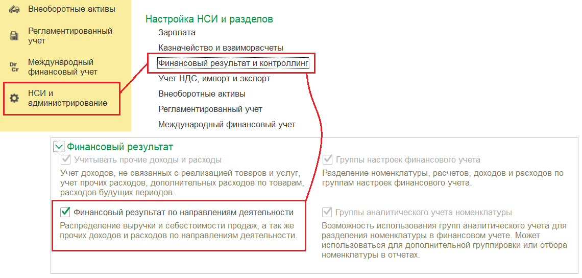 Для осуществления учета по направлениям деятельности требуется предварительное включение функциональной опции в разделе «НСИ и администрирование» – «Финансовый результат и контроллинг» – «Финансовый результат» – «Финансовый результат по направлениям деятельности».