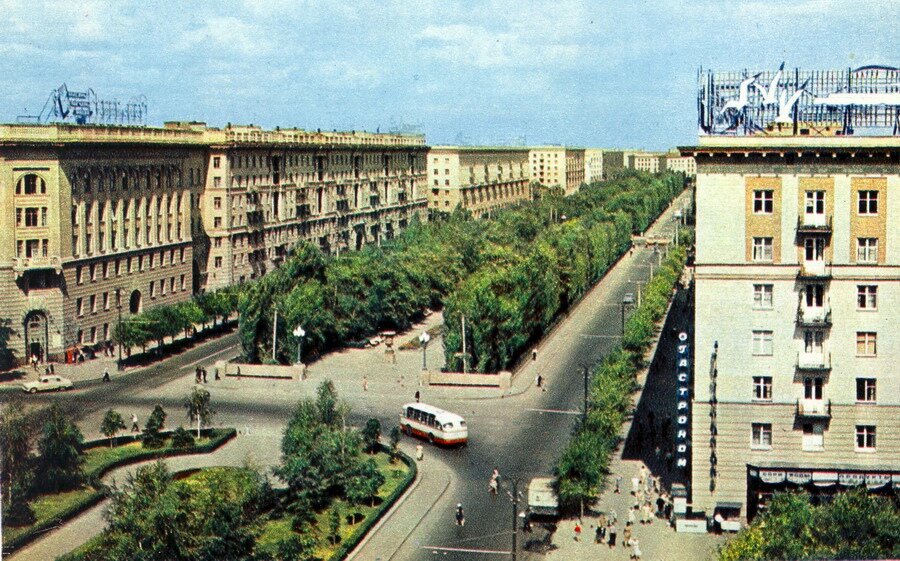 Трамвайная остановка Центральный парк культуры и отдыха на проспекте Ленина. Снова стеклянные киоски, похожие на те, что мы видели на Аллее Героев. В 1964 году тут открыли новенький магазин с названием Фото – радио- музыка. Сегодня помещение занимает обычный сетевой продуктовый магазин.