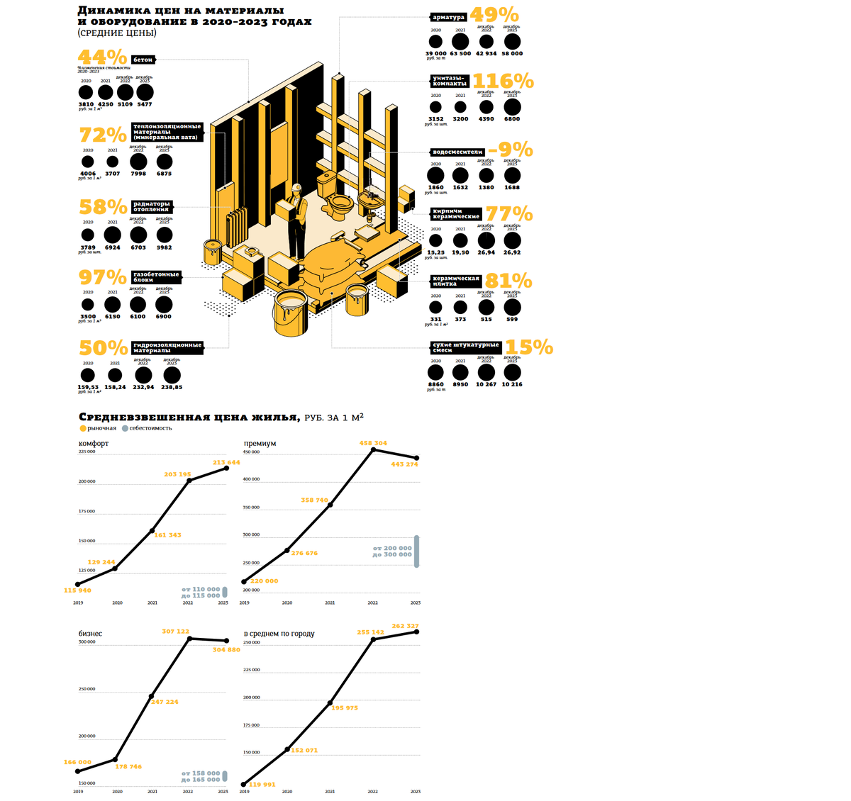 Стоимость возведения квадратного метра жилья может разниться в зависимости от его класса, заложенных технических и инженерных решений, благоустройства и так далее. Большую часть затрат в структуре себестоимости занимает возведение самого конструктива здания, остальное — стоимость участка, оплата инженерии, подключения к коммуникациям, возведение инфраструктуры, благоустройство.