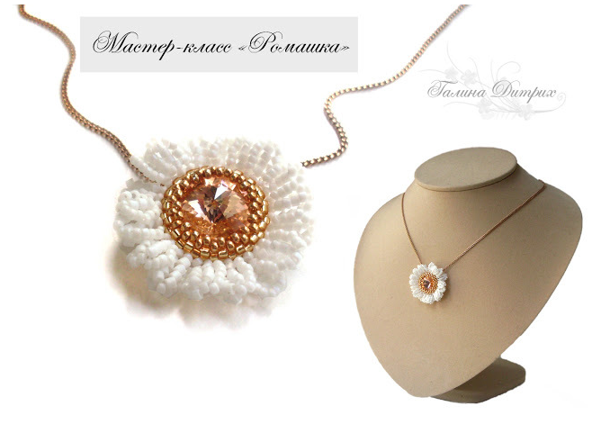 Добрейшего всем дня! Продолжаю публиковать мастер-классы известного бисерного дизайнера Галины Дитрих. Начало - здесь: Серьги "Бронзовый жемчуг" Оплетение бусин любых форм и размеров Серьги в технике "Кораллы" А еще у нас как-то был опубликован ее МК по сережкам "Янтарная карамель". Дублировать его не буду, но ссылку оставлю, они очень красивые. Да и в описании украшения, которое я выкладываю сегодня, есть отсылка к этим серьгам, так что лишней она точно не будет. Сегодня будем учиться плести нежную красавицу-ромашку. Ссылка на первоисточник: каталог мастер-классов на Ярмарке Мастеров Ссылка на магазин Lumi-art (Галина и Дмитрий Дитрих) Дальше - текст автора МК. Сложность: средняя Материалы: игла, нить, бисер, тохо, делика, toho, delica, miyuki, миюки, кристаллы, кристаллы сваровски (swarovski), риволи, риволи сваровски (swarovski) Перед моим любимым праздником "Семьи, Любви и Верности" мне очень захотелось сделать мастер-класс по плетению ромашки из бисера. Лично я каждый год одеваю р