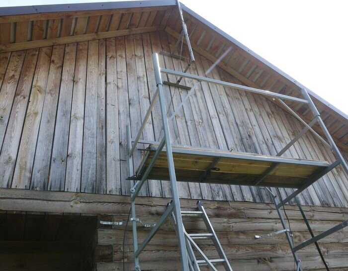 Довольно часто чердачное пространство домов и сараев используется как склад для нужных и ненужных вещей. Для этого во фронтонах построек вырезается проём, на который навешивается самая простая дверь, сделанная из старых досок. Обычно такие двери никак не декорируют и ничем не украшают. Пройдясь по сельским поселениям российской глубинки, в этом можно легко убедиться, просто обратив на них внимание. Вы увидите серые двери на фоне серых фронтонов из выцветших от солнца и почерневших от дождя досок. Однако это легко исправить, не прилагая больших усилий. Для примера возьмём самый обычный деревянный фронтон самого обычного деревенского дома. Чтобы удобнее было работать, соберём рядом с домом вышку-туру. Закинуть автору на чай можно здесь. Размер полотна будет равным 130 на 80 см. Этого достаточно для затаскивания на чердак различных предметов. Первым делом нанесём на фронтон разметку, по которой бензопилой вырежем доски. Чтобы линии были ровные, воспользуемся строительным уровнем. Аккурат