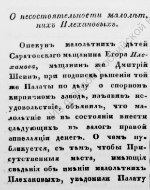 Текст: опекун малолетних детей мещенина Егора Плеханова, мещанин Дмитрий шейн, при подписке решения той же Палаты по делу о спорном кирпичном заводе, изъявив недовольство, объявил что малолетние не в состоянии внести в залог правой аппеляции денег. о чем публикуется, с тем, чтобы присутственные места, имеющие сведения об имении малолетних Плехановых, уведомили Палату о несправедливости показаний опекуна Шейна.