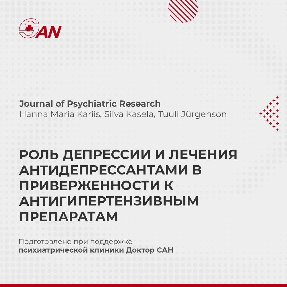 Более высокие уровни артериального давления у пациентов с депрессией могут быть связаны с более низкой приверженностью к антигипертензивным препаратам (АГП). В анализе данных электронных медицинских карт изучалась роль длительно существующей депрессии в приверженности к АГП, а также взаимосвязь между началом приема антидепрессантов и индивидуальными изменениями в приверженности к АГП среди пациентов с гипертонией с впервые диагностированной депрессией. Данные анализа показали, что депрессия была связана с снижением приверженности к АГП на 6% и снижением шансов продолжения приема АГП на 12%. Поправка на социально-демографические, генетические факторы и факторы, связанные со здоровьем, не оказала существенного влияния на эти ассоциации. Приверженность к АГП увеличилась на 8% через шесть месяцев после начала терапии антидепрессантами. Подробнее о лечении депрессии: https://doctorsan.ru/lechenie-depressii