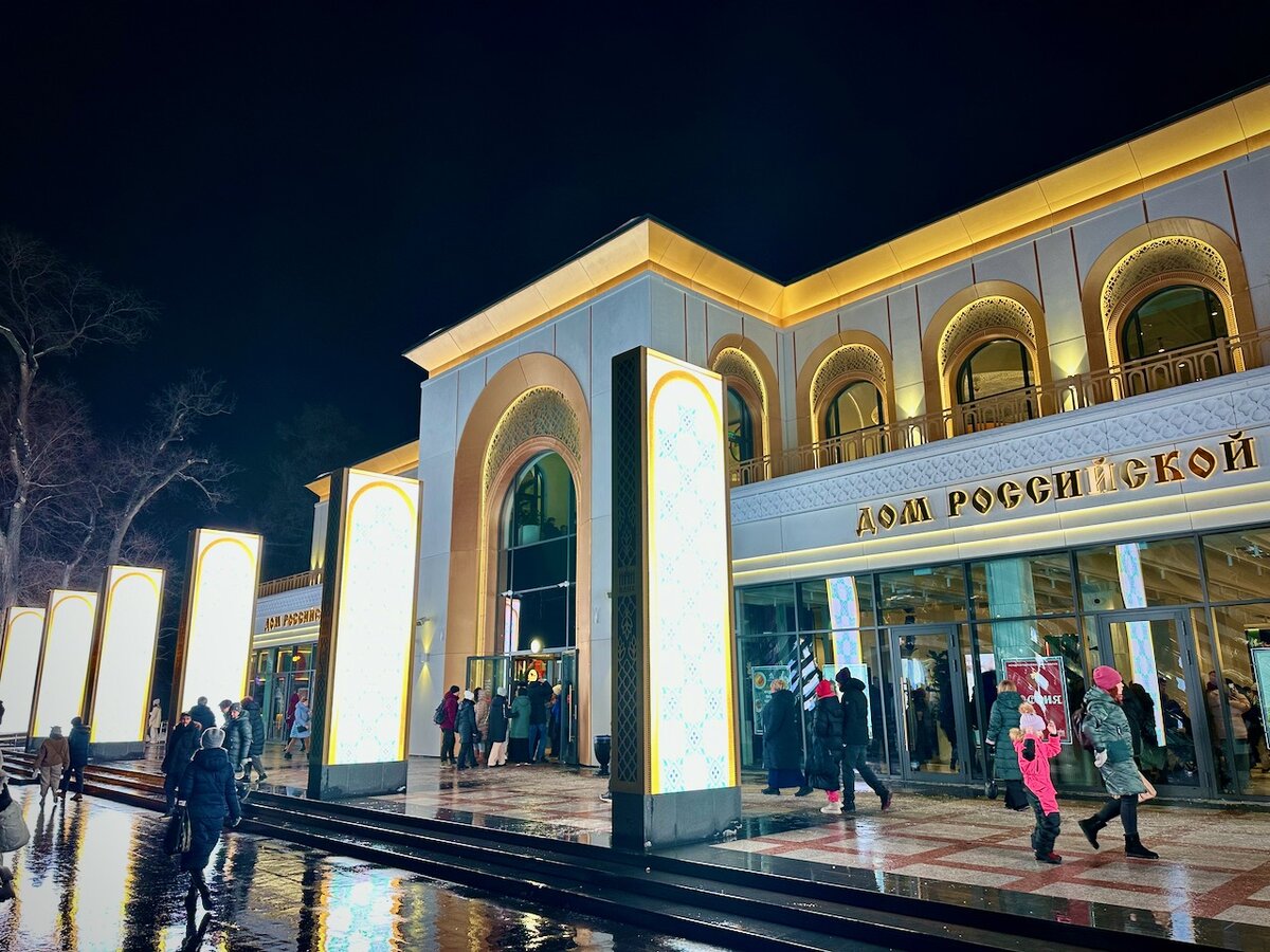 До темноты на ВДНХ оставался целый час, который на холоде коротать не хотелось, поэтому мы решили пойти в тепло. А заодно перекусить, а еще заодно посмотреть, что из себя представляет новый павильон «Дом российской кухни». И вот что я скажу – не надо ходить туда в выходные и праздничные дни. Те толпы людей, которые ходят по ВДНХ, заходят и сюда. Поэтому за едой очереди, место за столиком нужно караулить, а заказ придется ожидать гораздо больше обещанных десяти минут. Мы ждали свои пельмени сорок минут, например. А ведь выбрали их только потому, что типа готовятся быстро. Вообще, идея отличная. В одном месте можно попробовать дагестанские чуду, бурятские буузы, ростовский курник, карельские калитки и тульские калачи (вот с этим мы немножко подзависли – разве Тула славится именно калачами?). Цены не то чтобы демократичные, но можно найти блюда по вполне вменяемой цене. Есть и бар, в котором можно попробовать крепкие и некрепкие напитки и даже коктейли с отсылкой к российским природным да