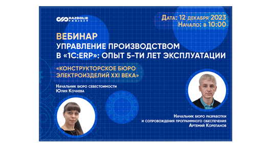 Коллеги, 12 декабря в 10:00 по МСК приглашаем вас на вебинар. О внедрении ERP-системы и 5-летнем опыте её использования на предприятии машиностроения расскажут специалисты АО «КБЭ XXI века»: начальник бюро разработки и сопровождения программного обеспечения Артемий Корепанов, начальник бюро себестоимости Юлия Кочнева, а также – руководитель проектов ВЦ «Раздолье» Вера Пикурен. Расскажем: Предварительная регистрация обязательна. *АО «КБЭ XXI века» – конструкторское бюро с производственными мощностями. Предприятие решает задачи по разработке, изготовлению и испытанию изделий электрозащиты, коммутации и светотехники для авиационной, железнодорожной, судостроительной промышленности. #ВЦРаздолье #КБЭXXIвека #1СERP #1СЕРП #внедрение #реализованныйпроект #обучение #вебинар #себестоимость #MES #прослеживаемость #архитектура #отчетность